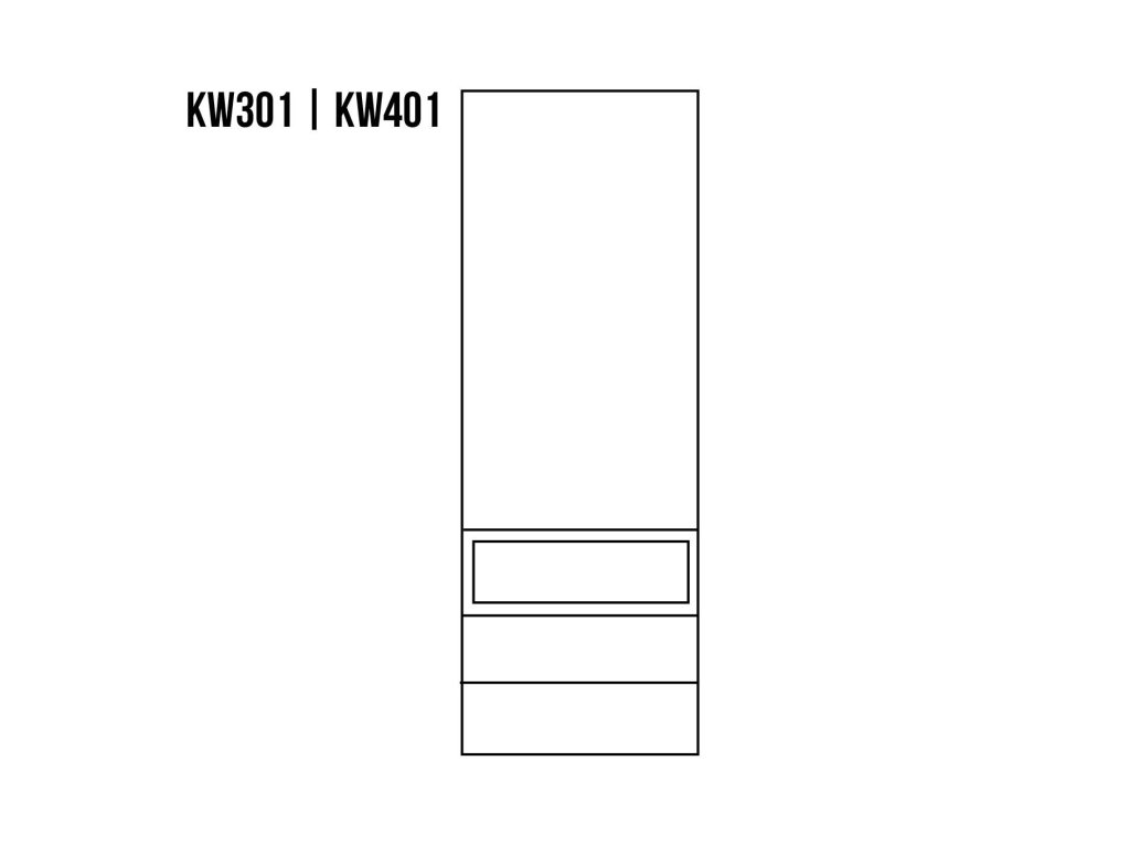 Vitrína KW301 levá má dvířka ze sklem, šuplík a dvířka - za nimi polici.