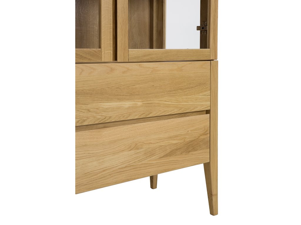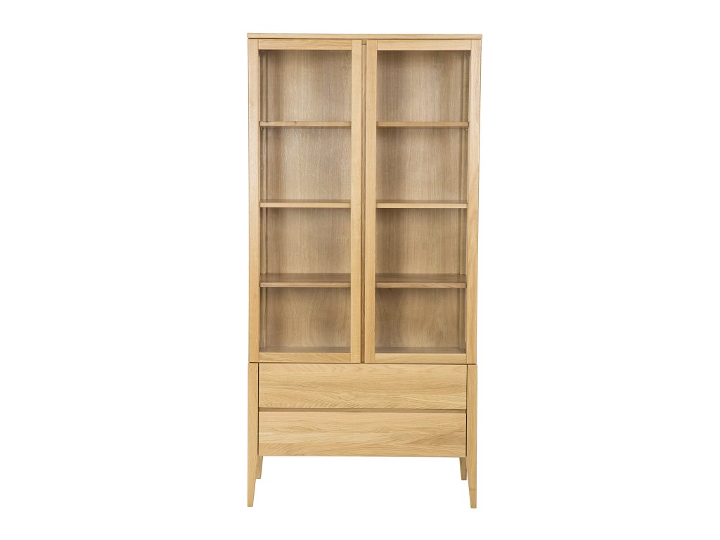 Vitrína KW339 má 2 dvířka ze sklem a 2 šuplíky.