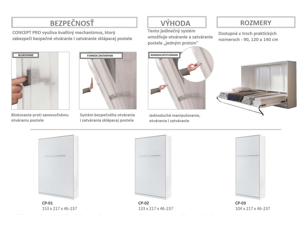Výklopná postel CONCEPT PRO CP-02 se vyklápí vertikálně teda na výšku. Postel CONCEPT je vhodná na každodenní spaní. Postel je vybavena popruhy se zapínaním pro matraci a ložní prádlo na zaklopení - pro jednodušší stlaní - aby nic nevypadlo. Jednoduchý systém ovládaní výklopu postele - speciální FUNKCE STOP zajišťuje bezpečné otváraní a zavíraní postele. Postel je taky vybavena pojistkou, která zabrání otvíraní postele menším dětem nebo samovolnému otevření. Z bezpečnostních důvodů doporučujeme postel přimontovat ke zdi - montážní sada je součástí balení. Po sklopení postele zůstane pod postelí prostor 20,4cm. Postel nemá úložní prostor, ale lze přikoupit policovou skříň CONCEPT CP-07 nebo CONCEPT CP-08 - najdete v naší nabídce... K posteli lze přiobjednat bíle LED osvětlení CP1 - v případě zájmu napište do poznámky v objednávce