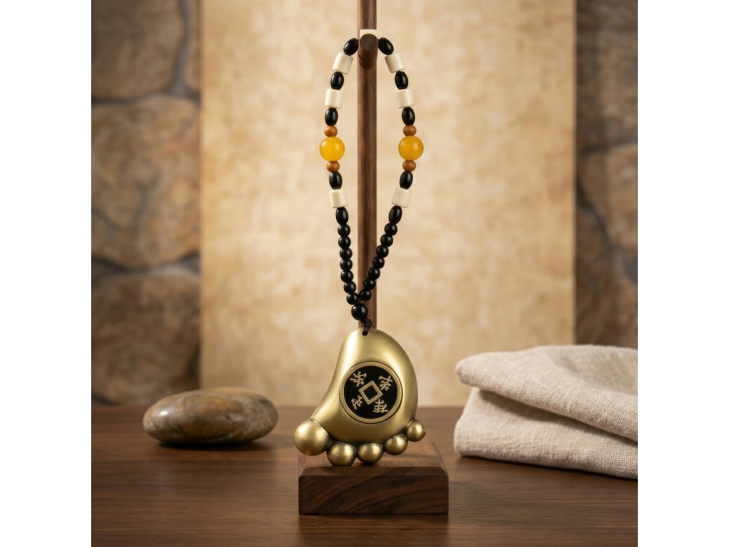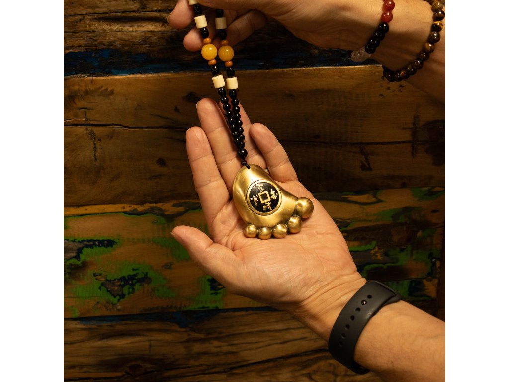 Tento závěsný prvek Feng Shui představuje masivní mosazný amulet ve tvaru nohy, uprostřed kterého je zasazena tradiční čínská mince bohatství. V symbolice Feng Shui představuje noha pohyb, pokrok a příchod, často spojované s bohatstvím, které k vám proudí a neustále roste, spíše než aby zůstalo statické. Motiv mince posiluje témata prosperity, toku peněz a ochrany finanční energie. Amulet je vyroben z masivní mosazi a má hladký, zaoblený tvar s teplým antickým povrchem, který mu dodává tradiční a těžký vzhled. Vyvýšené detaily podél základny dodávají texturu, zatímco stylizované čínské znaky na minci se symbolicky používají jako požehnání pro štěstí a úspěch. Tento amulet, zavěšený na dekorativní korálkové šňůře kombinující černé, krémové, jantarové a dřevěné korálky, se tradičně umisťuje poblíž vchodů, pokladen, stolů nebo vyhrazených míst pro bohatství v domácnosti nebo na pracovišti. Přidejte tento amulet Feng Shui do svého sortimentu a poskytněte zákazníkům smysluplný dekorační kus spojený s pokrokem, prosperitou a finanční stabilitou.Doplňkové parametry