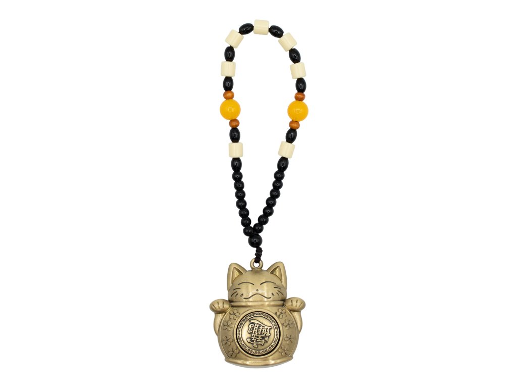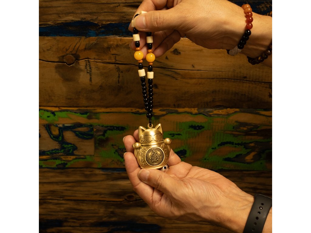 Tento závěs ve stylu Feng Shui zobrazuje Šťastnou kočku, známou také jako Maneki-neko, známý symbol štěstí, prosperity a příležitostí ve východoasijské tradici. Zobrazení s mincí bohatství odráží témata finančního toku, pozitivních výsledků a úspěchu v podnikání a obchodu. Figurka je vyrobena z mosazi s měkkou antickou povrchovou úpravou a má teplý, tradiční vzhled, který se hodí do moderních i klasických interiérů. Ryté detaily na těle a minci dodávají texturu, zatímco červený akcent na zadní straně zdůrazňuje symbolické spojení se štěstím a vitalitou. Stylizované čínské znaky vypadají jako dekorativní požehnání spojené s bohatstvím a hojností. Tento kus, zavěšený na korálkové závěsné šňůře kombinující černé, krémové, jantarové a dřevěné korálky, nabízí vyvážený vizuální kontrast a harmonické využití barev Feng Shui. Lze jej snadno zavěsit v blízkosti vchodů, pokladen, stolů, polic nebo prostor pro bohatství v domácnosti nebo na pracovišti, kde se tradičně používá k uvítání prosperity a ochraně finanční energie. Přidejte tento talisman ve tvaru Šťastné kočky do svého sortimentu a nabídněte zákazníkům smysluplný dekorativní přívěsek se silnou kulturní symbolikou a širokou atraktivností pro maloobchod.Doplňkové parametry