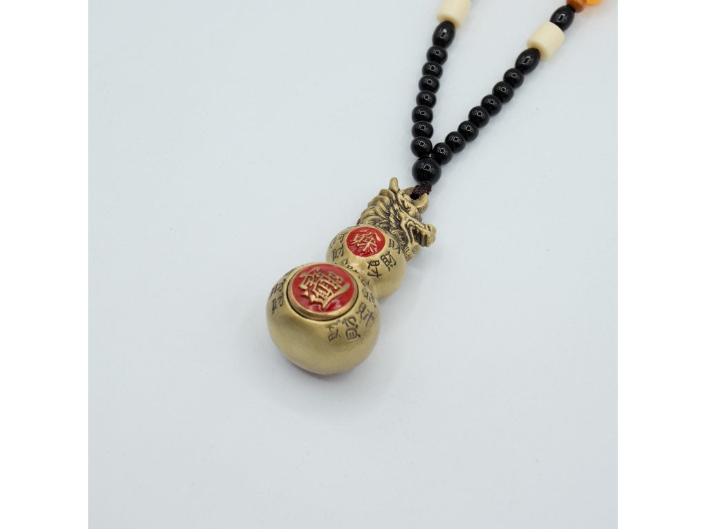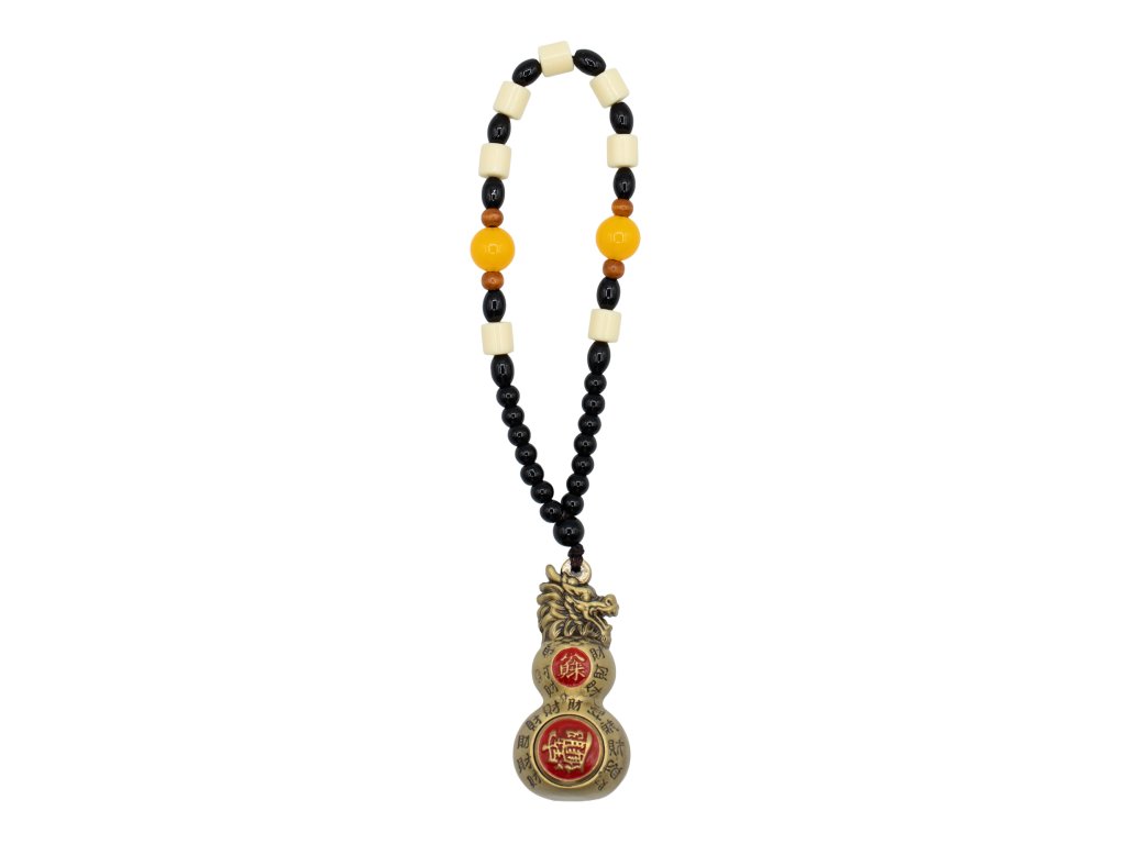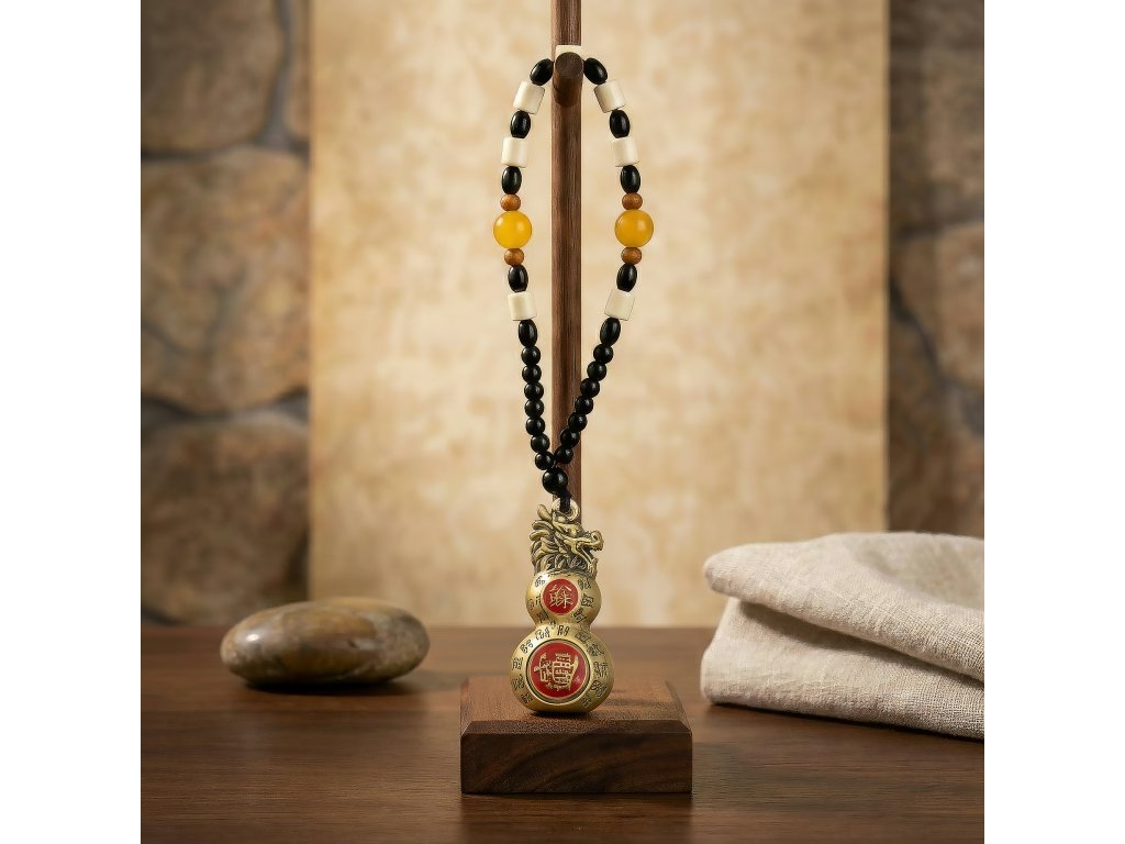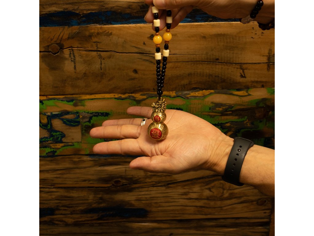 Tento závěs Feng Shui obsahuje tradiční dvojitou tykev (Wu Lou) zakončenou dračí hlavou, uznávaným symbolem zdraví, vitality a dlouhého života. Ve Feng Shui je tykev spojována s léčivou energií a ochranou před negativními vlivy, zatímco dvojitý tvar představuje rovnováhu a kontinuitu. Dračí hlava dodává další vrstvu symboliky, která je spojena se silou a ochranou životní síly. Vyrobeno z masivní mosazi s teplým antickým povrchem, má tento kus hladký, zaoblený tvar a uklidňující hmotnost. Červené akcenty ve tvaru mince a ryté znaky v čínském stylu se symbolicky používají jako požehnání pro blaho a dlouhověkost. Zavěšený na dekorativní korálkové šňůře kombinující černé, krémové, jantarové a dřevěné korálky, se tradičně umisťuje do ložnic, obývacích prostor nebo oblastí souvisejících se zdravím. Přidejte tento závěs Feng Shui do svého sortimentu a nabídněte zákazníkům smysluplný dekorativní kus zaměřený na zdraví, ochranu a dlouhodobou pohodu.Doplňkové parametry